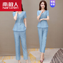 南极人轻奢职业套装女2021年新款夏季休闲时尚高端洋气棉麻气质减龄两夏 蓝色(两) M