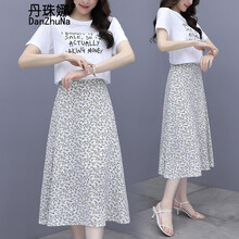 丹珠娜 短袖连衣裙女装夏季新款流行气质碎花裙子T恤女+时尚高腰长裙两件套套装裙子女中长款 绿色 M