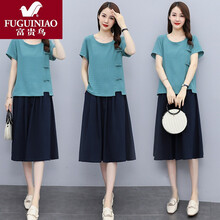 富贵鸟 时尚亚麻套装裙子中长款2021夏天新款宽松休闲两件装棉麻连衣裙女 浅蓝 M