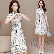 睿顺鑫旗袍改良版连衣裙夏女装2021年夏装新款小个子复古收腰显瘦时尚气质高端妈妈裙子米白色 2XL(建议125斤-135斤)