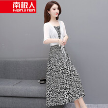 南极人高档品牌女装 雪纺碎花连衣裙女2021夏季新款高端洋气小个子减龄吊带裙子两件套套装透气显瘦时尚 979黑色樱桃套装 S