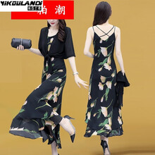 碎花雪纺连衣女两2021年夏季新款时尚气质显瘦吊带套装子喜妮微裳女装遥朵矣服饰 黑色 M建议105斤以下