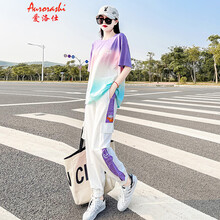 爱洛仕运动套装女夏季新款炸街大码卫衣上衣胖mm网红少女港风时尚休闲两件套 紫色上衣+白色裤子 XXL