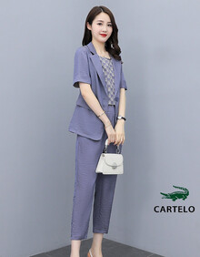 ℘卡帝乐鳄鱼ℑ轻奢品牌2021新款夏季小西装三件套女气质贵夫人收腰显瘦小脚裤职业时尚套装时尚女装 紫色(三件套) L