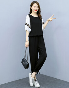 高档轻奢品牌运动休闲套装女职业2021年新款女夏装小个子洋气两件套套装夏季透气显瘦时尚女装 黑色 M