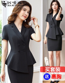 訫嗳逸衫短袖职业套装女西装夏季新品白领西服面试气质两件套裙商务酒店工作服 黑色西服+黑色裙子 4XL(适合140-148斤)