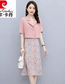 皮尔卡丹轻奢品牌女装 西装连衣裙职业套装裙女春夏装2021年新款气质女神范两件装裙子潮针织 粉色 M