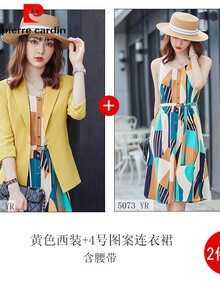 皮尔卡丹品牌女装休闲小西装套装裙女夏装2021年新款夏天时尚职业装连衣裙两夏针织 黄色西装+4号图案连衣裙(含腰带) S