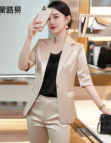 萨蒙路易薄款白领职业装女2021年夏季韩版时尚高级感中袖夏天小西服外套醋酸西装套装 杏色(中袖西装) L