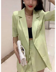 雅鹿品牌气质名媛职业西服套装女2021夏季新款韩版小西装半身裙短裤两件套 绿色 S