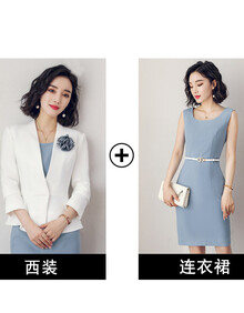 职业套装女高端连衣裙时尚西装气质正装面试夏天袖工作服两件装 白色长袖西装+无袖雾霾蓝连衣裙 XXXL