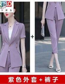 卡帝乐鳄鱼品牌女装紫色小西装外套女夏季常规韩版短袖气质女神范职业装网红西服套装 紫色短袖外套+裤子 S