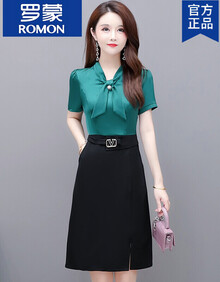 罗蒙旗舰官方店高端女装轻奢雪纺连衣裙女夏假两件衬衫职业套装时尚高端气质修身包臀裙夏裙子针织 绿色短袖 XL