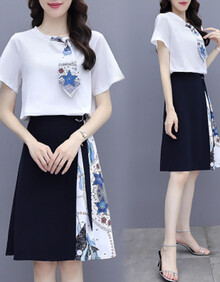 羽虹阁时尚连衣裙套装女2021夏季新款设计感T恤半身裙印花拼接显瘦减龄女人味两件装职业气质裙 图片色 L