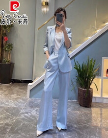 皮尔卡丹高档女装 感西装套装女韩版2021年夏季薄款醋酸缎面职业休闲阔腿裤西服针织 浅蓝色七分袖西装+阔腿裤 M