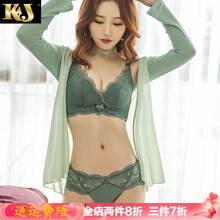 法国KJ无钢圈文胸女士性感小胸聚拢蕾丝文胸套装上托侧收防下垂少女内衣调整型透气大码胸罩新款 绿色 80B=36B(配内裤)