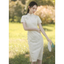 素雅复古旗袍裙女夏改良连衣裙年轻款白色民国风气质长款高端 21115 米白色XS8382 S