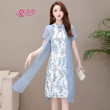 慕芭琪妈妈装旗袍连衣裙女2021春夏新款复古假两件中国风印花优雅气质大码显瘦阔太太改良旗袍裙子 天蓝 L