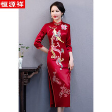 恒源祥时尚妈妈装高贵优雅气质改良旗袍婚礼服婚宴婆婆长款礼服中老年装 酒红色 M