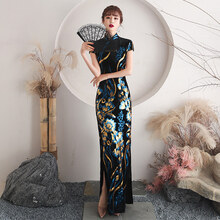 旗袍秀舞台演出服走秀旗袍加长款演出年轻款少女2021年新中国风改良版复古连衣裙优雅 长款亮片妖姬 L