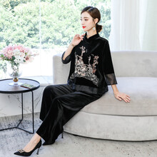 女士春款旗袍 中年中长女装中老年春秋祺袍妈妈棋袍连衣裙两件套改良上衣复古宽松气质优雅裤民族风套装 黑色 M