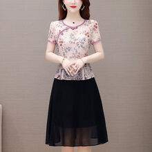女士碎花旗袍夏装改良版妈妈裙子假两件套气质收腰拼接雪纺连衣裙 杏色 (面料) L (建议95-105斤)