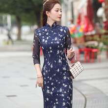 秀观唐蓝恋2020秋季新款改良蕾丝时尚碎花印花优雅修身中国风旗袍 藏蓝色 S