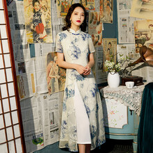 恒潮 改良版旗袍长款2021年春夏中国风年轻少女青花瓷奥黛连衣裙装 青瓷 XXL