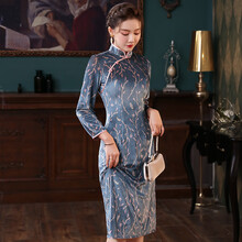 秀观唐缘知2020冬季新款优雅丝绒改良复古印花中国风旗袍连衣裙 蓝绿色 S