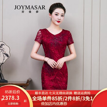 乔曼莎品牌女装婚礼旗袍立体花妈妈装婚宴蕾丝旗袍裙无开叉低领喜婆婆婚礼高贵礼服短款夏 酒红色 L