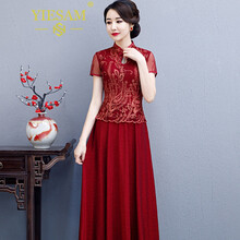 YISHAN连衣裙女夏品牌女装婚庆妈妈装高贵喜婆婆婚宴旗袍连衣裙嫁女儿丈母娘岳母婚庆礼服裙 红色 短袖 L