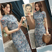 旗袍改良版旗袍性感旗袍女 年轻款大码夏季新蕾丝绣花雪纺日常时尚改良旗袍年轻优雅少女短连衣裙 湖蓝色蕾丝印花中 M