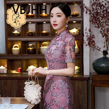 VBJHH 专柜2021夏季新款改良版网纱刺绣钉珠女士旗袍优雅气质减龄中长款连衣裙日常可穿 原创 紫色 M