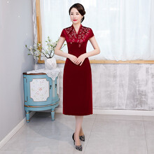 醋酸缎旗袍连衣裙绣花短袖结婚服2021夏季新款女 V领【短袖】醋酸刺绣酒红 4XL
