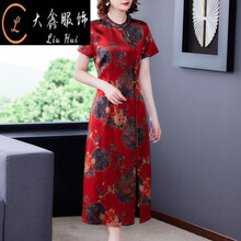 夏天穿的高端 祺袍中长连衣裙改良旗袍优雅气质妈妈装裙子长款短袖款流彗 红色 3XL
