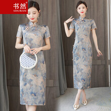 书然2021新款裙子女装夏40岁气质优雅时尚收腰遮肚子显瘦妈妈中国风改良旗袍碎花雪纺连衣裙女中长款 短款 L
