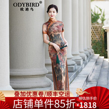 欧迪鸟(ODYBIRD)品牌女装复古民国风旗袍女2021夏季新款气质优雅修身日常长款裙子 橘红色 M