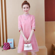 法国巴黎轻奢品牌真丝旗袍2021新款大码女装年轻款少女优雅中式中国风日常改良版复古汉服中长款雪纺同款 粉色中袖 S(85-100斤)