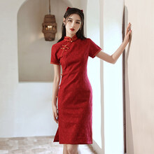 高端品牌女装2021夏季新款红色旗袍年年轻款高考考旗开得胜小个子少女连衣裙 0234八扣酒红色 S