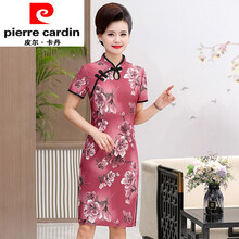 皮尔卡丹轻奢高端优雅高贵中老年女装妈妈装夏装改良中长款开叉旗袍短袖气质连衣裙 粉色 1XL