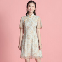 新式改良旗袍裙女短款2021夏季新款中国风复古蕾丝时尚改良旗袍连衣裙短袖立领优雅时尚复古旗袍雅旗依 粉兰 S