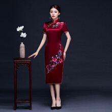 旗袍女2021夏季新品立体绣花喜婆婆丈母娘婚礼服新款短袖醋酸旗袍可水洗 1935酒红色 M
