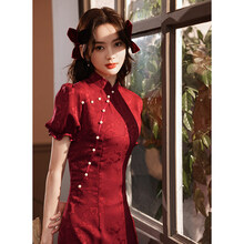 法式改良泡泡袖酒红色旗袍敬酒服新娘日常复古修身连衣裙少女夏季 酒红色 S