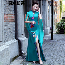 【冬上新】中国风旗袍秀长款优雅水袖复古大码改良高端走秀舞台演出服女长裙加大妈 绿色 量身定制不退换