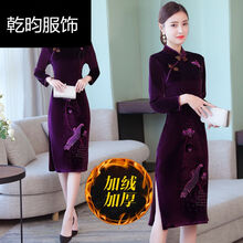 秋冬天女人旗袍加绒祺袍秋冬款中长中国风刺绣改良版连衣裙秋装新款妈妈金丝绒复古优雅气质礼服 紫色加绒9692# L