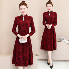 秋天旗袍裙40一50岁 祺袍秋冬款气质妈妈装中国风改良子2020春秋优雅中年亮丝中长款连衣裙女 红色 M