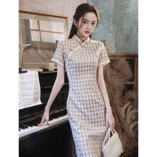 民国格子旗袍年轻款复古气质中长款少女夏季改良版连衣裙文艺修身 浅灰格子 M
