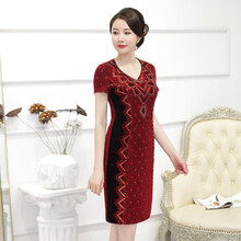 婚礼妈妈装旗袍女2021夏季新款中老年大码弹力绣花烫钻打底裙短袖夏装烫钻裙子 红色(短袖) L