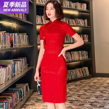 高考红色旗袍年轻款少女夏季2021年新款复古改良连衣裙短款小个子 大红九宫格短袖 S
