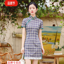 旗袍连衣裙女2021夏季薄款格子旗袍文艺复古气质短款时尚中国风改良版年轻款少女连衣裙 20304 短格紫 S